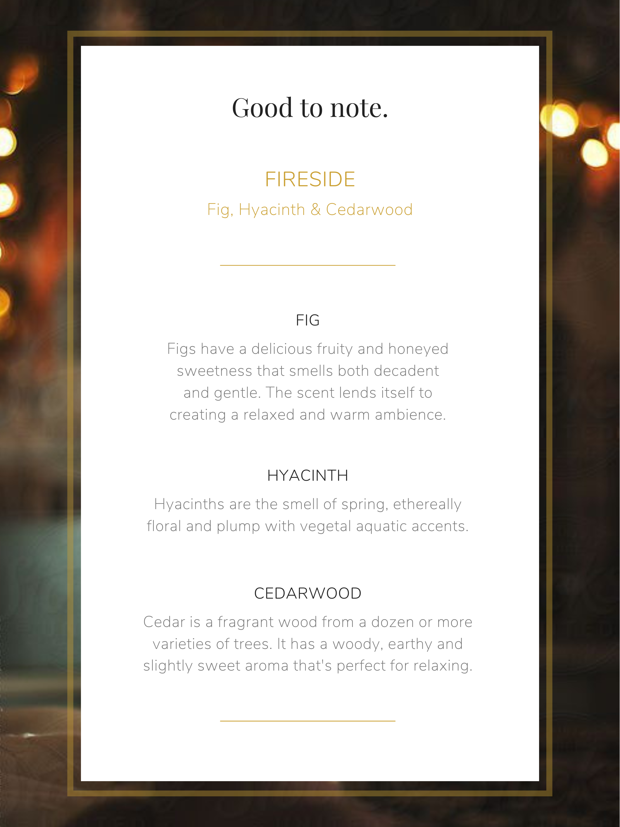 Bring home Fireside this winter season and make your space smell like the holidays. With a heart-warming concoction of Fig, Hyacinth and Cedarwood, this fragrant candle makes a snug companion for chilly evenings.