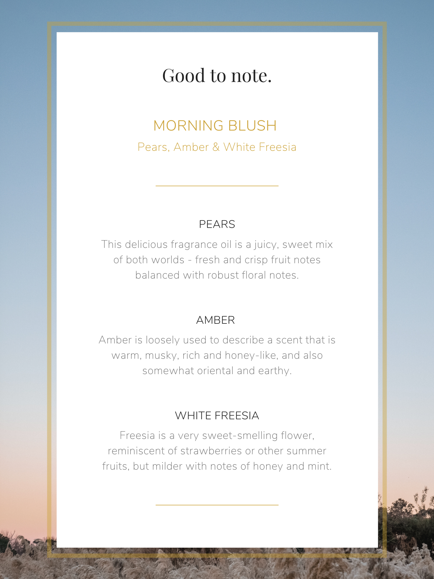 Start your day on the right note with Morning Blush. Luscious Pears meet woody Amber and White Freesia for a happy halo that lingers through the day.
