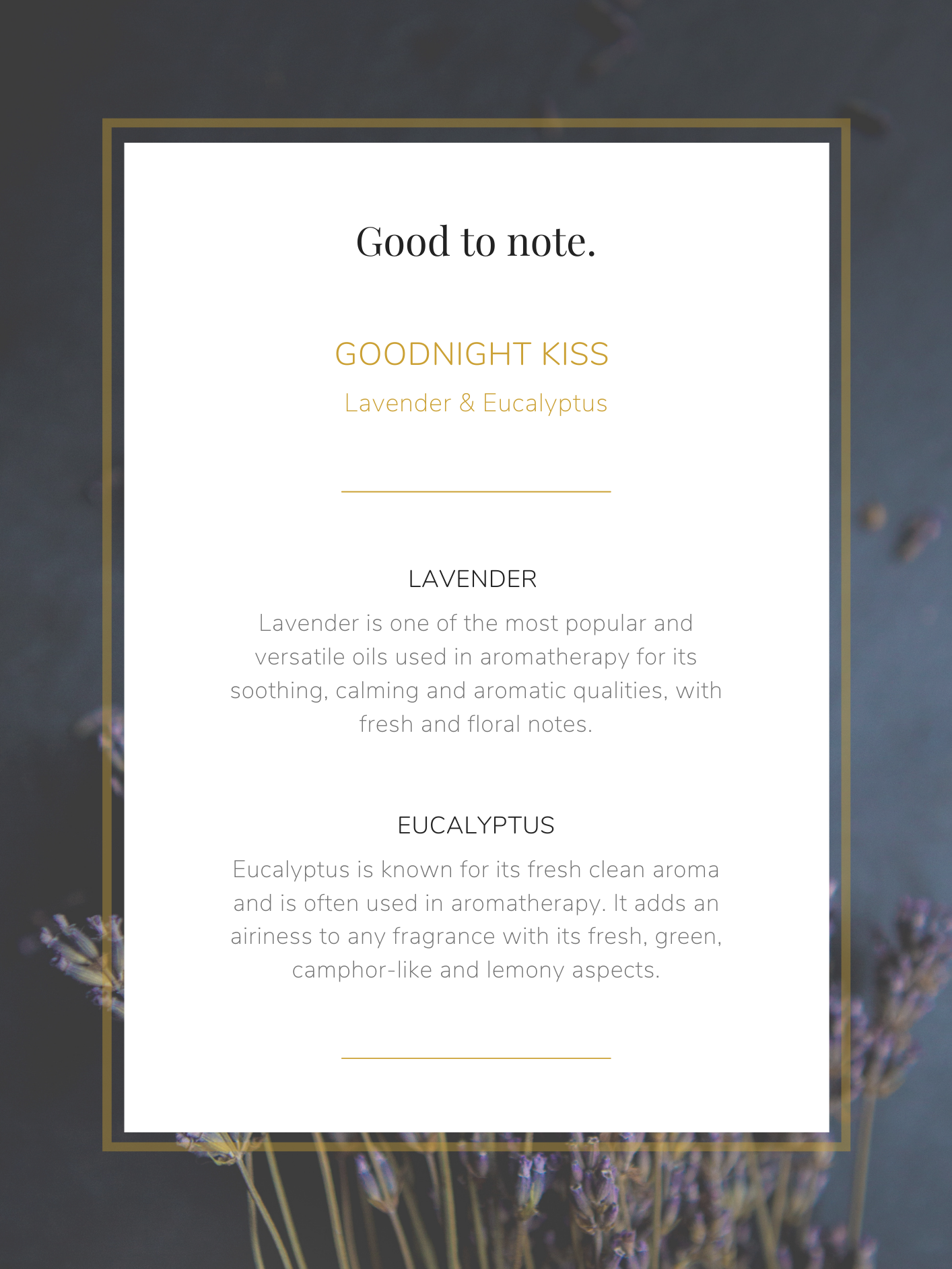 Goodnight Kiss with timeless Eucalyptus and Lavender is the perfectly relaxing candle, as you prepare to unwind after a long day.